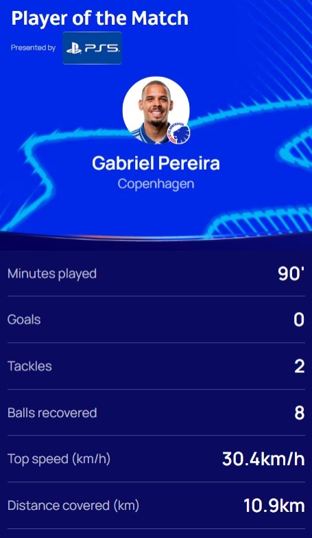本场比赛哥本哈根后卫佩雷拉发挥出色,2次抢断,8次赢回球权,赛后当选欧冠官方评选出的本场最佳球员。