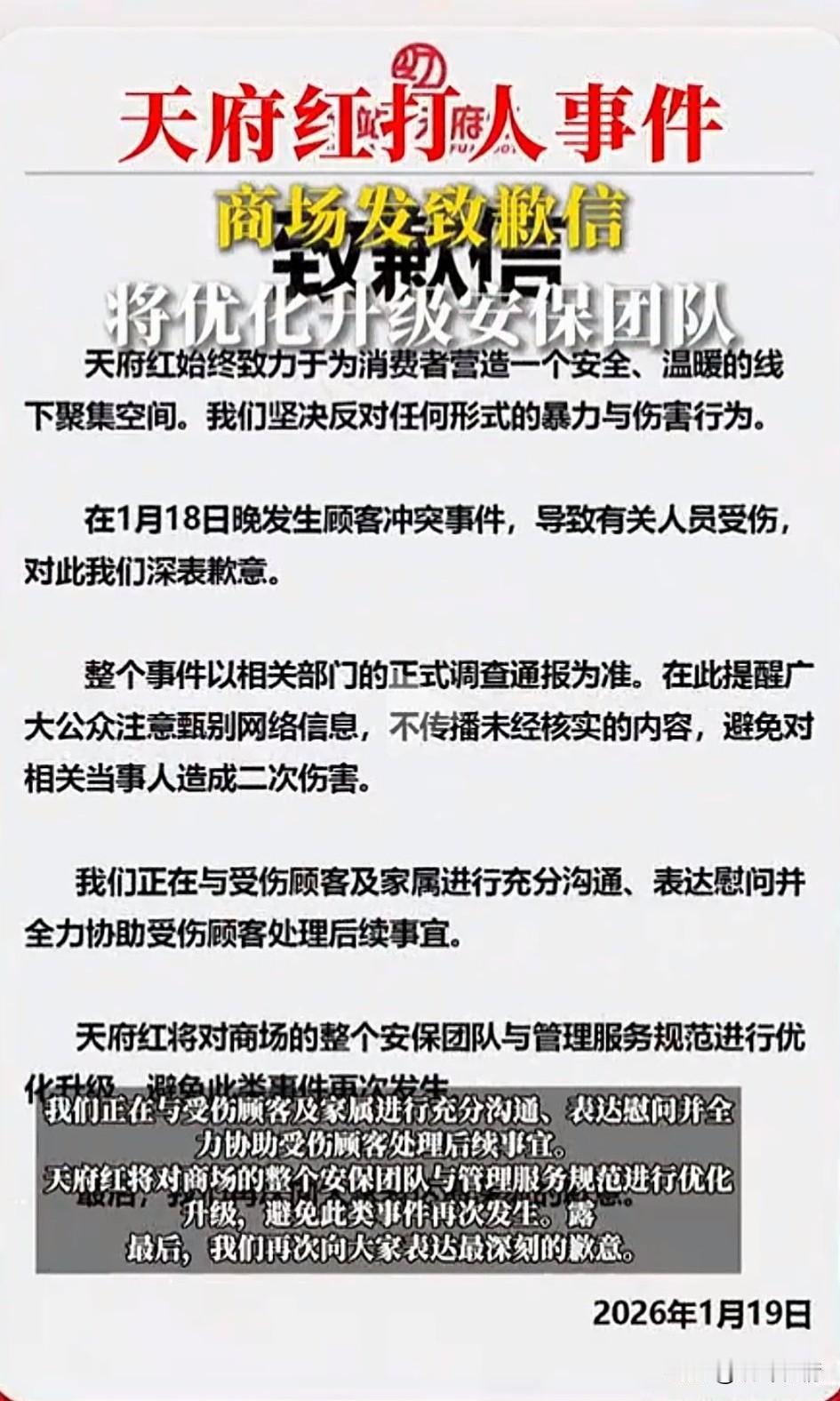 四川殴打五人事件后续来了,16岁少年已经被立案调查!商场已经发布道歉信! 1月18号20时许,四川成都天府红,一名16岁少年拿着摄影机和五名Coser发生语言冲突,因为双方是网络约来免费拍照的! 但是摄影师黄某迟到两小时才赶来,引发了五名扮演鬼灭之刃的Coser不满,由于女生何某说了人家! 16岁少年黄某突然暴起,将何某打倒在地,美瞳都碎在眼里了,可以看出下手比较狠, 其中两名女生上前拉扯阻止,也倒在地,另外两名女生看着如此场景,赶紧呼叫保安! 结果也被打倒在地,16岁男子黄某完成了1打5的壮举,天府商场的保安听到呼救也到场了, 不过都是一些岁数大的大爷,都现在附近看着五名女Coser被打,他们只能举起手机拍摄并协助报警! 面对舆论指责,商场也发表了道歉信,会加强安保巡逻,保证顾客安全! 大家对于四川天府红商场的道歉怎么看?不妨聊一聊! 成都 成都伤人事件 未成年人殴打