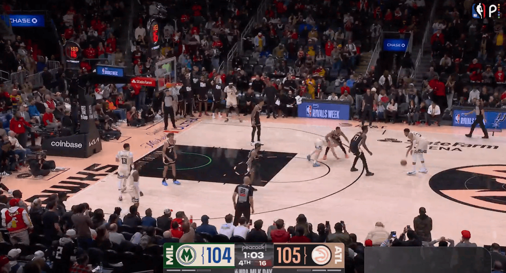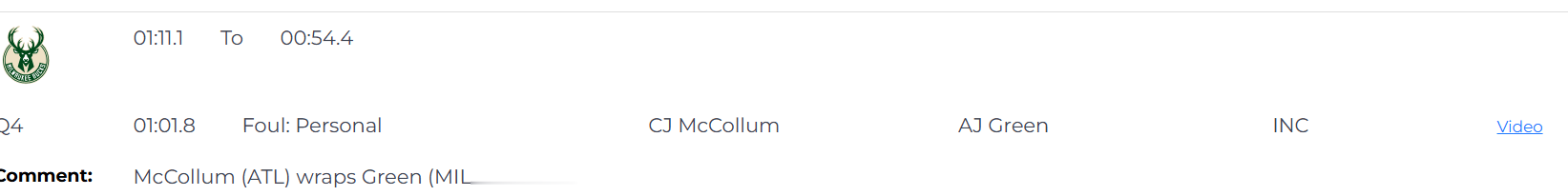 比赛最后1分03秒,老鹰球员CJ-麦科勒姆在无球端对雄鹿球员AJ-格林使用了非法身体接触,漏判了CJ的防守犯规。