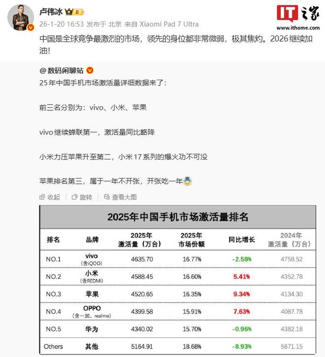 IT之家注意到,小米集团合伙人/总裁、手机部总裁、小米品牌总经理卢伟冰昨日发文回应了该数据信息,称中国是全球竞争最激烈的市场,领先的身位都非常微弱,极其焦灼。同时,他也表示2026年会继续加油。