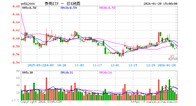 1月20日,券商ETF(512000)涨0.35%,成交额9.40亿元。当日份额减少7440.00万份,最新份额为680.81亿份,近20个交易日份额减少10.40亿份。最新资产净值计算值为392.97亿元。