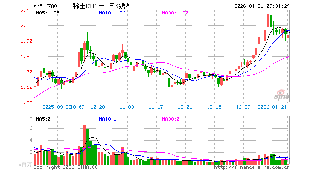 1月21日,稀土ETF(516780)开盘跌1.14%,报1.916元。稀土ETF(516780)重仓股方面,北方稀土开盘跌0.93%,卧龙电驱跌0.89%,领益智造跌1.10%,中国稀土跌1.00%,盛和资源跌1.30%,格林美跌0.99%,金风科技跌0.46%,包钢股份跌0.42%,厦门钨业涨0.55%,中国铝业跌0.68%。