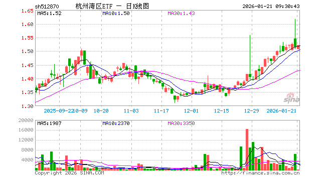 1月21日,杭州湾区ETF(512870)开盘跌0.59%,报1.506元。杭州湾区ETF(512870)重仓股方面,三花智控开盘跌1.40%,海康威视涨2.86%,同花顺涨1.44%,杭州银行跌0.13%,宁波银行涨0.77%,拓普集团跌0.55%,豪威集团跌0.72%,中微公司跌0.09%,恒生电子跌0.62%,小商品城涨0.12%。