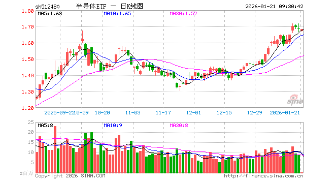 1月21日,半导体ETF(512480)开盘跌0.65%,报1.671元。半导体ETF(512480)重仓股方面,中芯国际开盘跌1.02%,寒武纪跌0.57%,海光信息涨3.65%,北方华创跌0.24%,澜起科技涨0.70%,兆易创新涨1.03%,中微公司跌0.09%,豪威集团跌0.72%,芯原股份跌1.22%,长电科技跌0.97%。