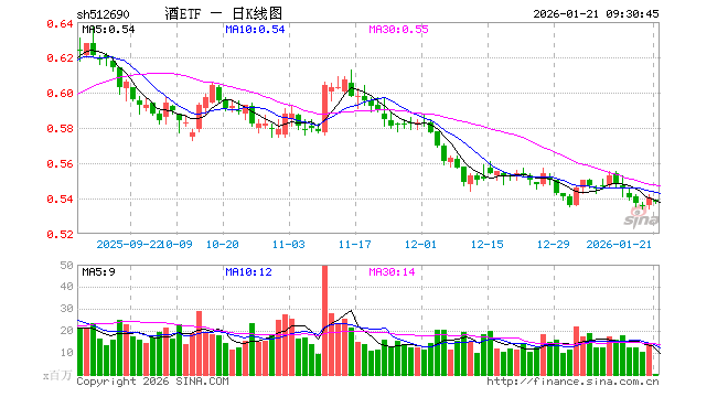 1月21日,酒ETF(512690)开盘跌0.19%,报0.539元。酒ETF(512690)重仓股方面,贵州茅台开盘涨0.00%,五粮液跌0.28%,泸州老窖跌0.56%,山西汾酒涨0.01%,洋河股份跌0.53%,今世缘涨0.32%,古井贡酒跌0.24%,青岛啤酒涨0.00%,燕京啤酒涨0.56%,酒鬼酒跌0.71%。