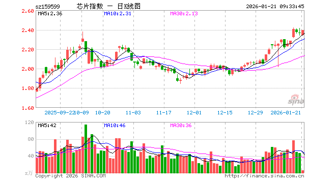 1月21日,芯片ETF东财(159599)开盘跌0.89%,报2.341元。芯片ETF东财(159599)重仓股方面,中芯国际开盘跌1.02%,寒武纪跌0.57%,海光信息涨3.65%,北方华创跌0.24%,澜起科技涨0.70%,兆易创新涨1.03%,中微公司跌0.09%,豪威集团跌0.72%,芯原股份跌1.22%,长电科技跌0.97%。