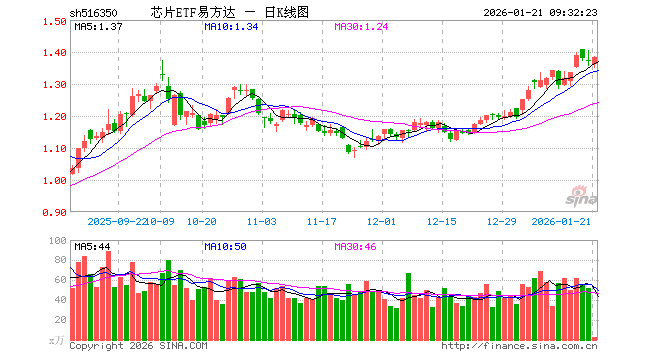 1月21日,芯片ETF易方达(516350)开盘跌0.66%,报1.361元。芯片ETF易方达(516350)重仓股方面,中芯国际开盘跌1.02%,寒武纪跌0.57%,海光信息涨3.65%,北方华创跌0.24%,澜起科技涨0.70%,兆易创新涨1.03%,中微公司跌0.09%,豪威集团跌0.72%,芯原股份跌1.22%,长电科技跌0.97%。