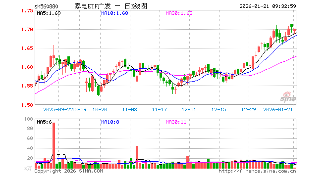 1月21日,家电ETF广发(560880)开盘跌0.59%,报1.694元。家电ETF广发(560880)重仓股方面,美的集团开盘跌0.05%,三花智控跌1.40%,格力电器涨0.05%,海尔智家跌0.19%,石头科技跌0.31%,四川长虹跌1.42%,麦格米特跌0.24%,科沃斯跌0.45%,海信视像涨0.00%,兆驰股份涨0.00%。