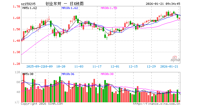 1月21日,创业板ETF东财(159205)开盘跌0.50%,报1.588元。创业板ETF东财(159205)重仓股方面,宁德时代开盘涨0.67%,中际旭创涨0.21%,东方财富跌0.04%,新易盛涨0.12%,阳光电源涨0.06%,胜宏科技跌0.24%,汇川技术跌0.29%,迈瑞医疗跌0.05%,亿纬锂能跌0.50%,温氏股份涨0.25%。