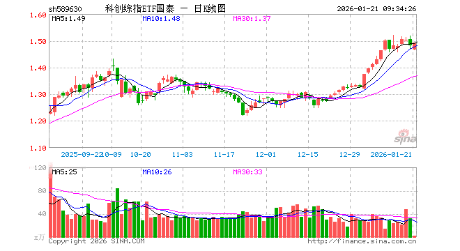 1月21日,科创综指ETF国泰(589630)开盘跌1.08%,报1.466元。科创综指ETF国泰(589630)重仓股方面,海光信息开盘涨3.65%,寒武纪跌0.57%,中芯国际跌1.02%,澜起科技涨0.70%,金山办公跌0.30%,中微公司跌0.09%,联影医疗涨0.17%,百利天恒涨0.33%,传音控股跌0.05%,影石创新跌0.14%。