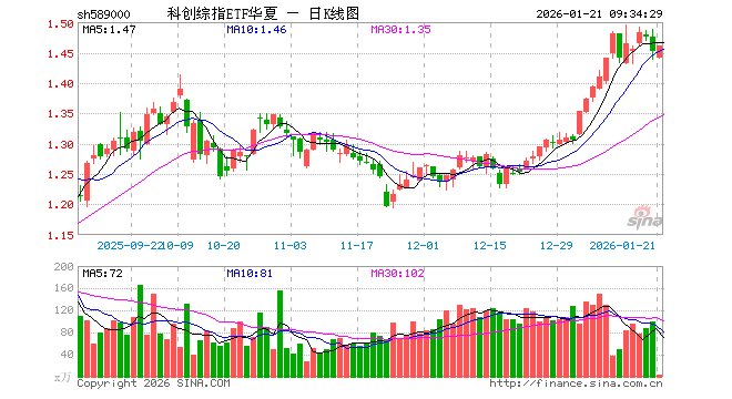 1月21日,科创综指ETF华夏(589000)开盘跌0.76%,报1.441元。科创综指ETF华夏(589000)重仓股方面,海光信息开盘涨3.65%,寒武纪跌0.57%,中芯国际跌1.02%,中微公司跌0.09%,澜起科技涨0.70%,百利天恒涨0.33%,金山办公跌0.30%,联影医疗涨0.17%,影石创新跌0.14%,传音控股跌0.05%。