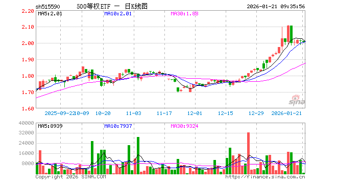 1月21日,500等权ETF(515590)开盘涨0.00%,报2.010元。500等权ETF(515590)重仓股方面,巨人网络开盘跌0.02%,先导智能跌1.21%,指南针跌0.35%,英维克跌0.32%,胜宏科技跌0.24%,东阳光跌0.57%,长川科技涨0.15%,江波龙跌0.44%,卧龙电驱跌0.89%,华工科技跌1.10%。