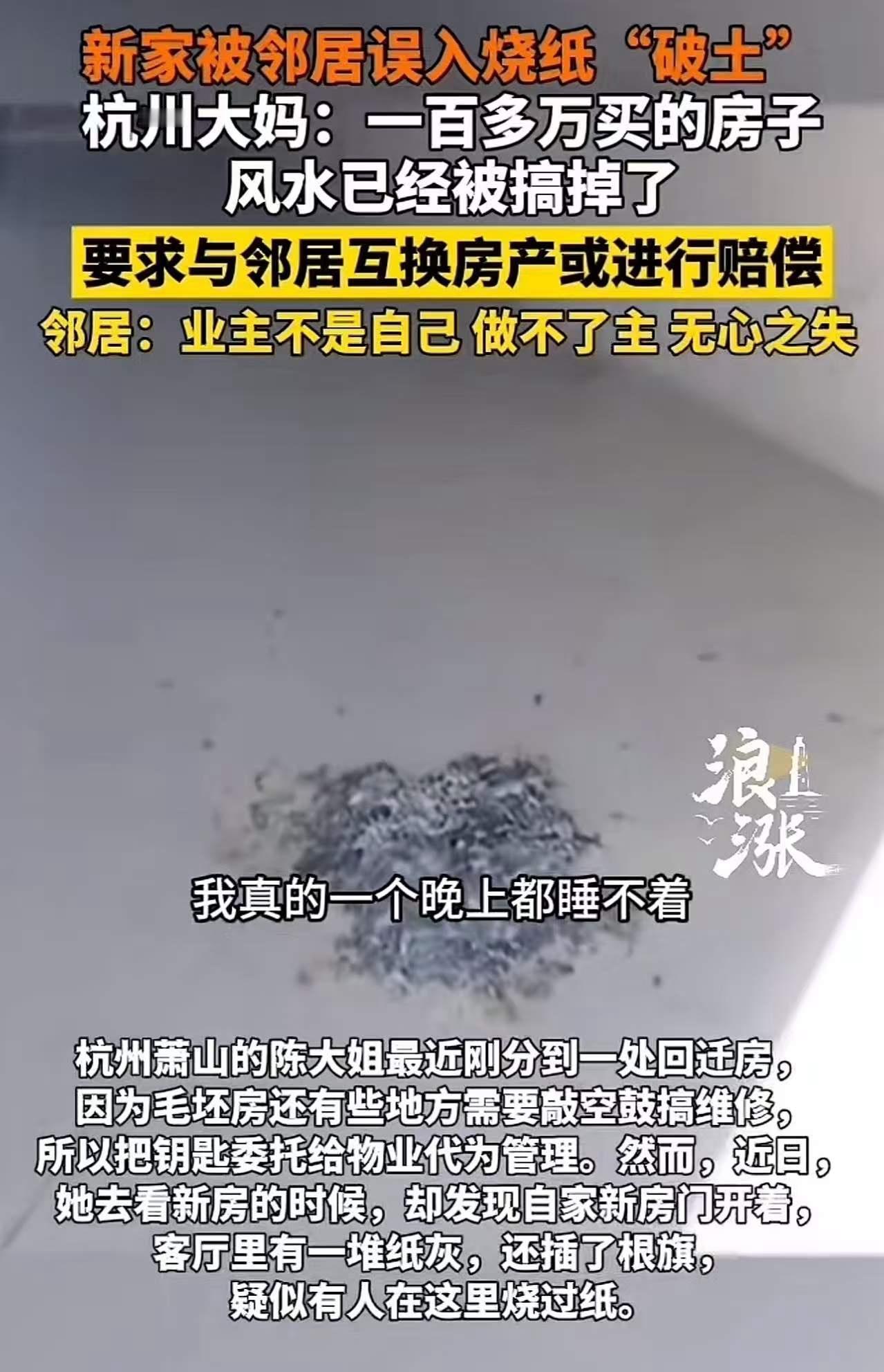 “太膈应人了!”这是浙江杭州一位普通大妈的心声,也是无数人在面对类似尴尬、荒诞场景时的真实写照。事情的起因很简单:她去收新房,推开门的瞬间,却被眼前的景象狠狠刺痛了眼睛——满屋子烧过的“元宝纸灰”,仿佛一场小型的“焚烧祭祀”残留在空气中,令人不寒而栗。这个场景,既荒诞又令人心生不安。 她第一反应,是愤怒与不解。难道有人在用这种方式“祭拜”祖先,竟然在自己邻居的房门口?更荒唐的是,邻居竟然否认自己有任何不当行为,声称自己“走错了”,无需大动干戈。这一幕,不禁让人深思:我们身边的“习俗”与“误会”,到底隐藏着怎样的社会文化冲突?又反映出哪些人性深处的矛盾与无奈? 这件事,像极了许多家庭的真实写照——在传统与现代、习俗与法律的交织中,很多人迷失了方向。有人说,祭祀是对祖先的尊重,但如果这种尊重变成了对他人的伤害或困扰,是否值得反思?更何况,邻里关系的和谐,难道不应该建立在相互理解和尊重之上?而不是一场“误会”引发的“赔偿战”。 从这件事中,我们可以洞察到更深层次的人性:人们在传统习俗的驱使下,是否失去了理性?在现代社会的快节奏中,我们是否还记得“尊重他人”的底线?每个人都在用自己的方式“祭拜”某些价值,但如果这种方式伤害了别人,是否还值得坚持?这不仅仅是一个邻里纠纷,更是当代社会“文化冲突”与“价值观碰撞”的缩影。 更令人深思的是,面对这样的“荒诞”,我们是否还能保持理智与善意?大妈的选择,是愤怒的反击,还是理性的诉求?警方的介入,又是否能成为调解人与理解的桥梁?在这个过程中,我们每个人都应该问问自己:我们愿意成为那个传递善意、理解和包容的人吗? 这件事,激起了许多人的共鸣,也引发了热烈的讨论:我们应如何在尊重传统的同时,避免无谓的冲突?邻里关系的“底线”在哪里?每个人都可以从中找到自己的影子——那份对“公平”、对“尊重”的渴望,正是我们这个时代最需要的正能量。 让我们用理性和善意,去化解每一场“荒诞”,用理解和包容,筑起更温暖的社区。因为,只有当我们都懂得尊重彼此的“底线”,这个社会才能变得更加和谐、美好。每个人的行动,都是点亮社会正能量的一盏灯。愿我们都能成为那盏灯,照亮自己,也温暖他人。