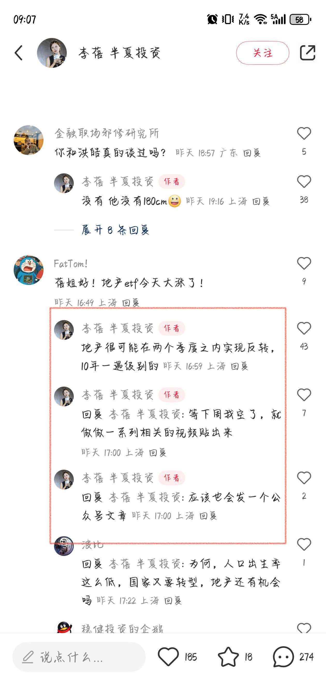 在评论互动区,李蓓回复称“地产很可能在两个季度之内实现反转,10年一遇级别的”,并表示“等有空会做一系列相关的视频贴”。