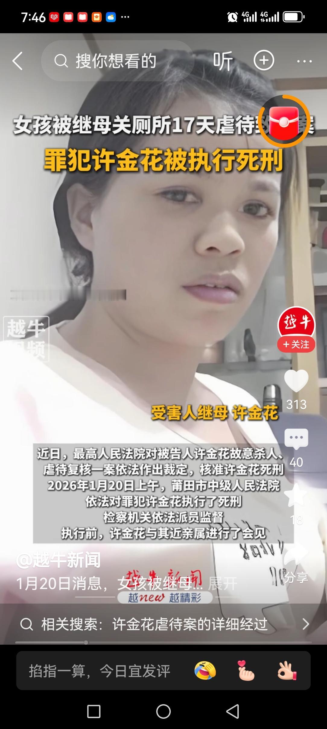 福建莆田刘思琪的继母被判S刑,昨天已经被执行了! 这个女人的身世被网友扒了出来,看了真是让人可怜又可恨! 许金花,出生于1983年,福建莆田本地人,今年43岁。幼年父母双亡,寄居在亲戚家长大的。 小学毕业就外出谋生了,有网友爆料她曾经从事过色情行业,导致她不孕不育。 成年和经别人介绍和本地的一位男子结婚了。因为许金花不能生育,两人领养了两个孩子,但是最后两人还是离婚了。 离婚后,许金花带着孩子依然住在前夫的村子里。后来遇到了同样离异带女儿的刘江,两个人就走到了一起。 刘江带着女儿住进了刘金花家,两人婚后又领养了一个孩子。刘江自己在镇上开面馆,每天忙得不可开交,几个孩子都是刘金花在带。 如果刘金花大度包容一点,她的晚年将会非常幸福,养了那么多孩子,老了都会孝敬她的! 童年坎坷的经历,让她全部都报复到了孩子的身上。对孩子们非打即骂,完全没有母亲的温情。 不爱也不要伤害,不明白刘金花为什么还要收养那么多孩子? 刘金花带着她罪恶走了,可惜小思琪再也回不来了!