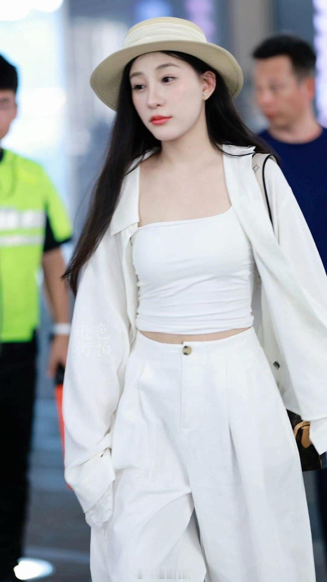 粉色针织开衫搭配白色荷叶边短裤街拍美女穿搭时尚穿搭