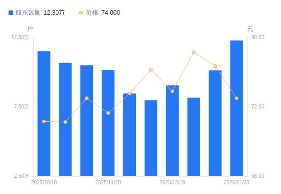 日期A股户数(户)流通A股户均持股数(股)户均持股市值(万元)2026-01-2012301711269.3583.392026-01-0910137513675.18111.402025-12-318167316974.05143.692025-12-199065215292.79115.642025-12-107977617377.68140.012025-11-288471716364.15122.832025-11-2010167113635.3796.272025-11-1010509013191.7697.662025-10-3110666912996.4889.032025-10-1011522812031.1282.62