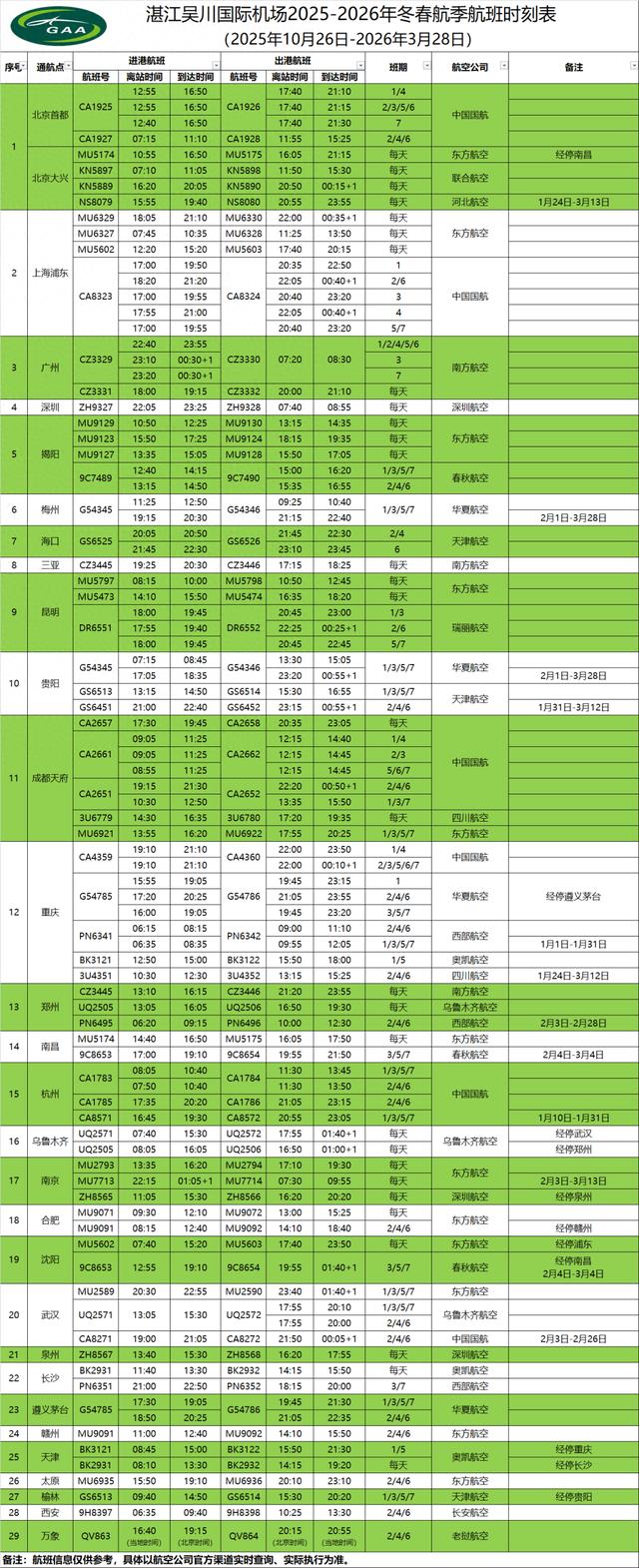 航班情况:2月3日至2月26日,新增湛江⇋武汉航线。班期为:每周二、四、六。