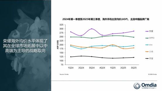 另一方面,中国手机厂商全球出货占比约六成,OPPO、vivo、小米、荣耀等厂商都处于前列。其中,荣耀去年增长迅速,Omdia的报告显示,2025年第一至第三季度,荣耀海外智能手机出货量同比增长约55%。在全球前十大智能手机厂商中,荣耀在同期实现了最显著的海外增长。