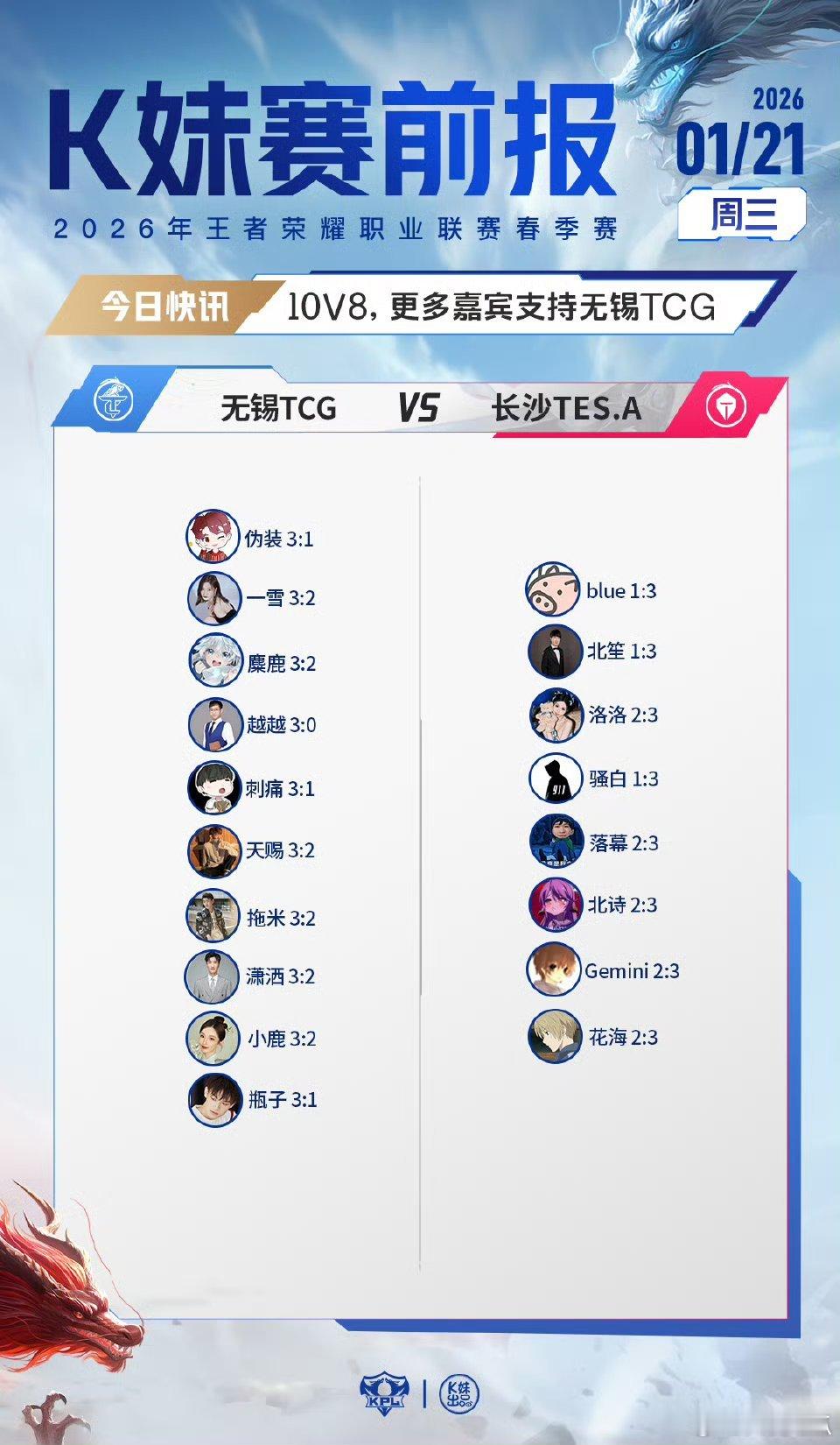 2026KPL春季赛|K妹赛前报8V10,更多嘉宾看好桐乡情久;1V18,无老师一人力挺西安WE;10V8,更多嘉宾支持无锡TCG。