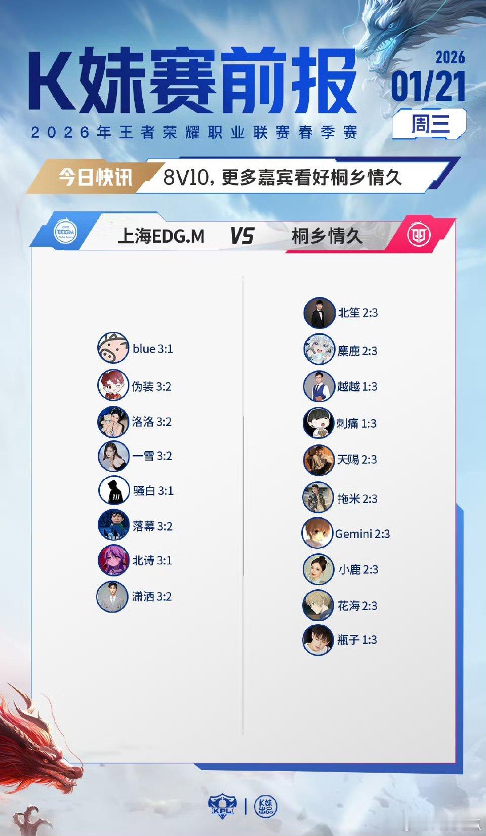 2026KPL春季赛|K妹赛前报8V10,更多嘉宾看好桐乡情久;1V18,无老师
