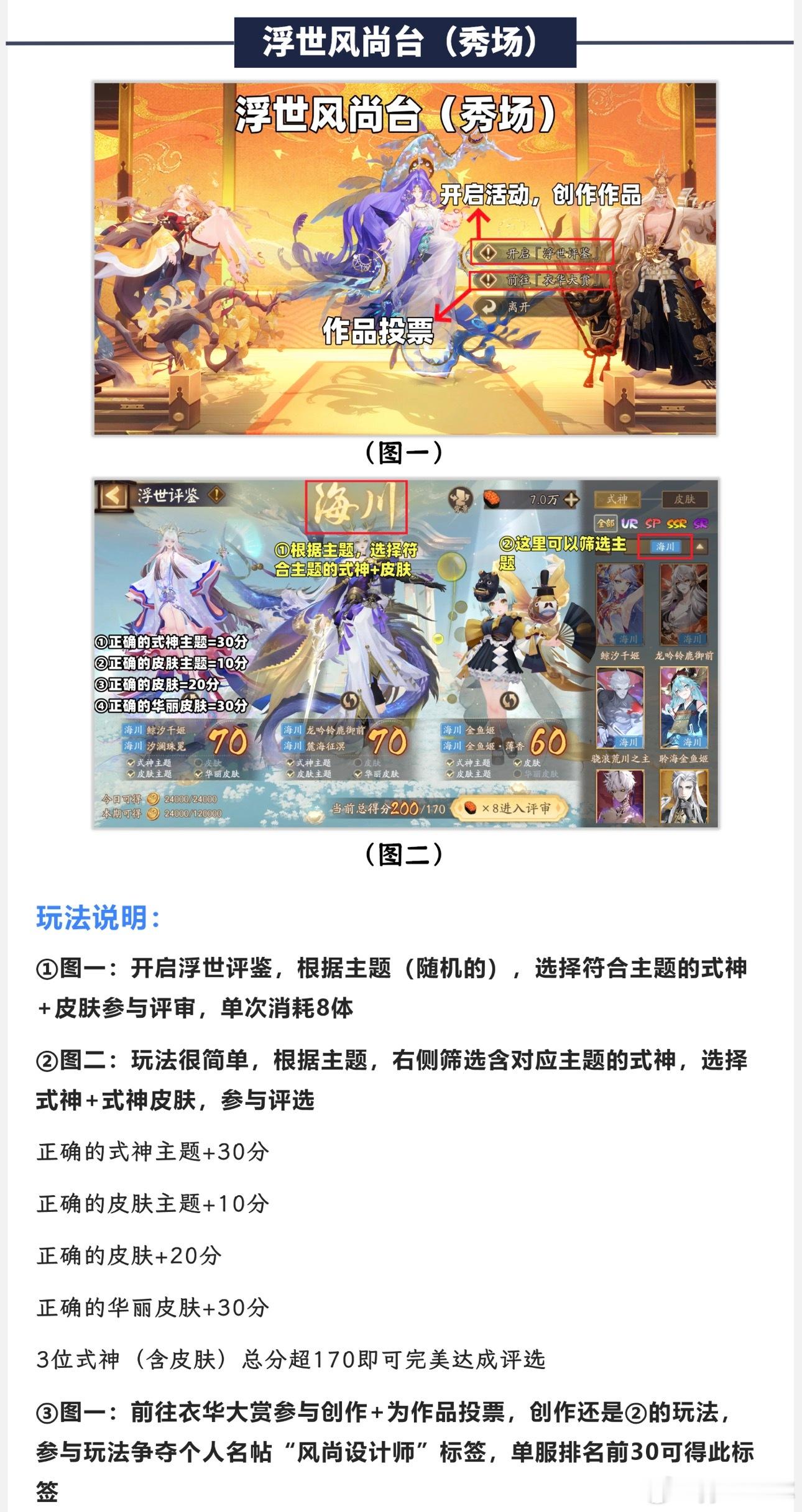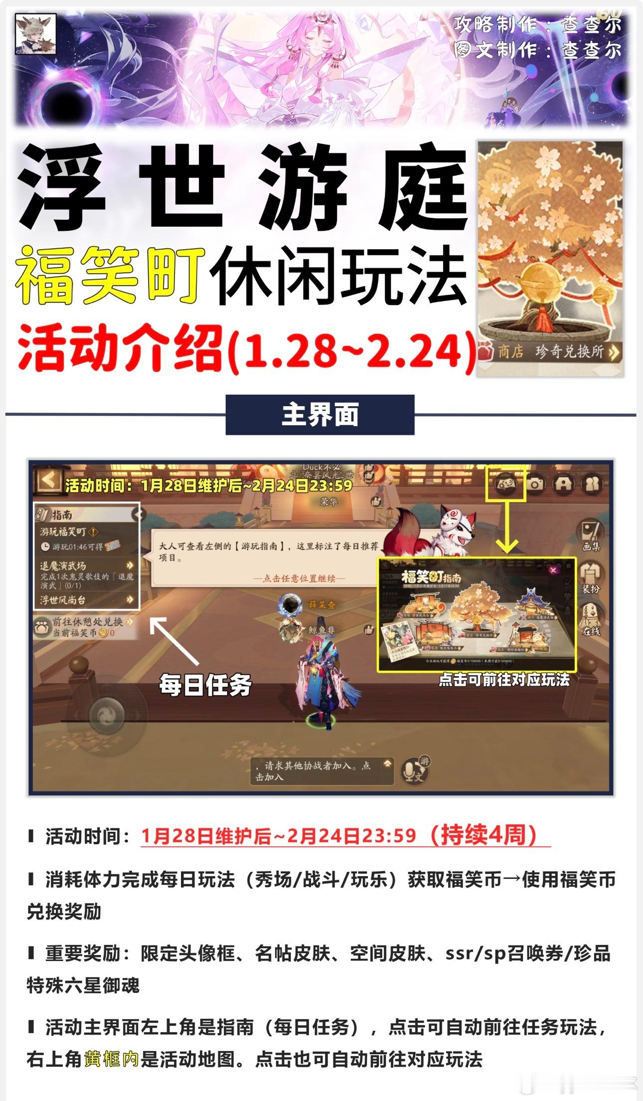 阴阳师手游超话创作官acg优创官 【浮世游庭】玩法+内容详情(前瞻攻略)■活动时间:1月28日~2月24日(持续4周)■都是些小活动,游玩活动得福笑币,以下是收益参考:①每日完成活动得10.8w福笑币(每周上限54w)②每日完成奇遇得3000福笑币(每周上限未知)③每周成就得21.4w福笑币④活动成就得19w福笑币■4周不算每日奇遇,总计=320.6w福笑币(商店解锁顺序:开局/60w/120w/280w)