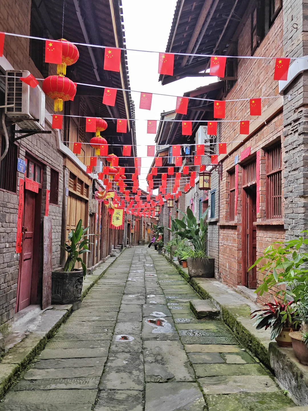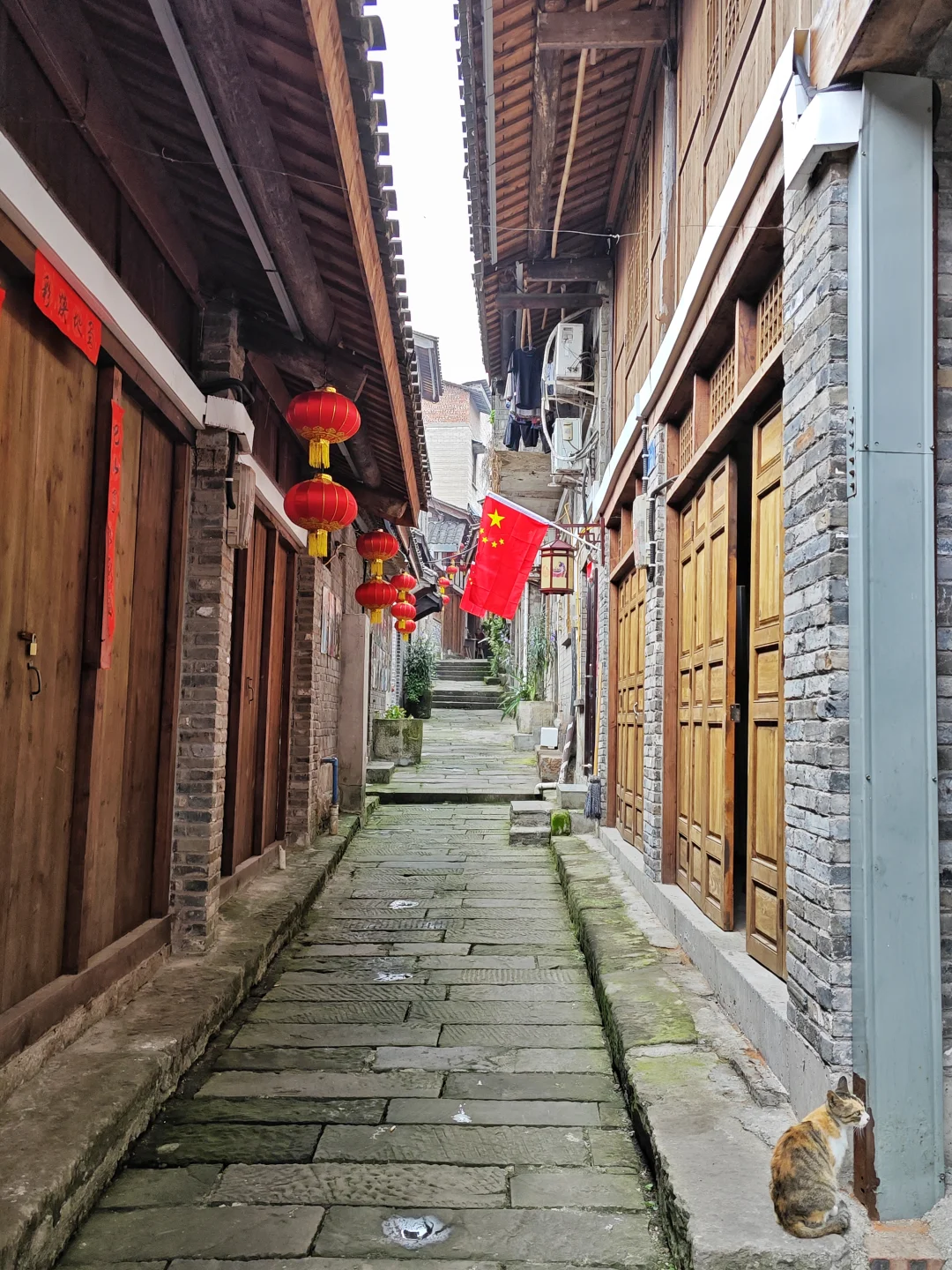 最后,白沙镇江边有一大败笔,就是新修的白沙“古镇”。全是新建“老房子”,装修得有模有样,挂着彩灯、旗帜,但讽刺的是,几乎一个游客都没有,说门可罗雀一点也不夸张。我去的时候还是国庆长假,才有零零星星几个游客走过,大部分门面都已经关闭,整个“古镇”连卖东西的都几乎没有,完全是失败典型,也不知道花的谁的钱,又有谁背锅。