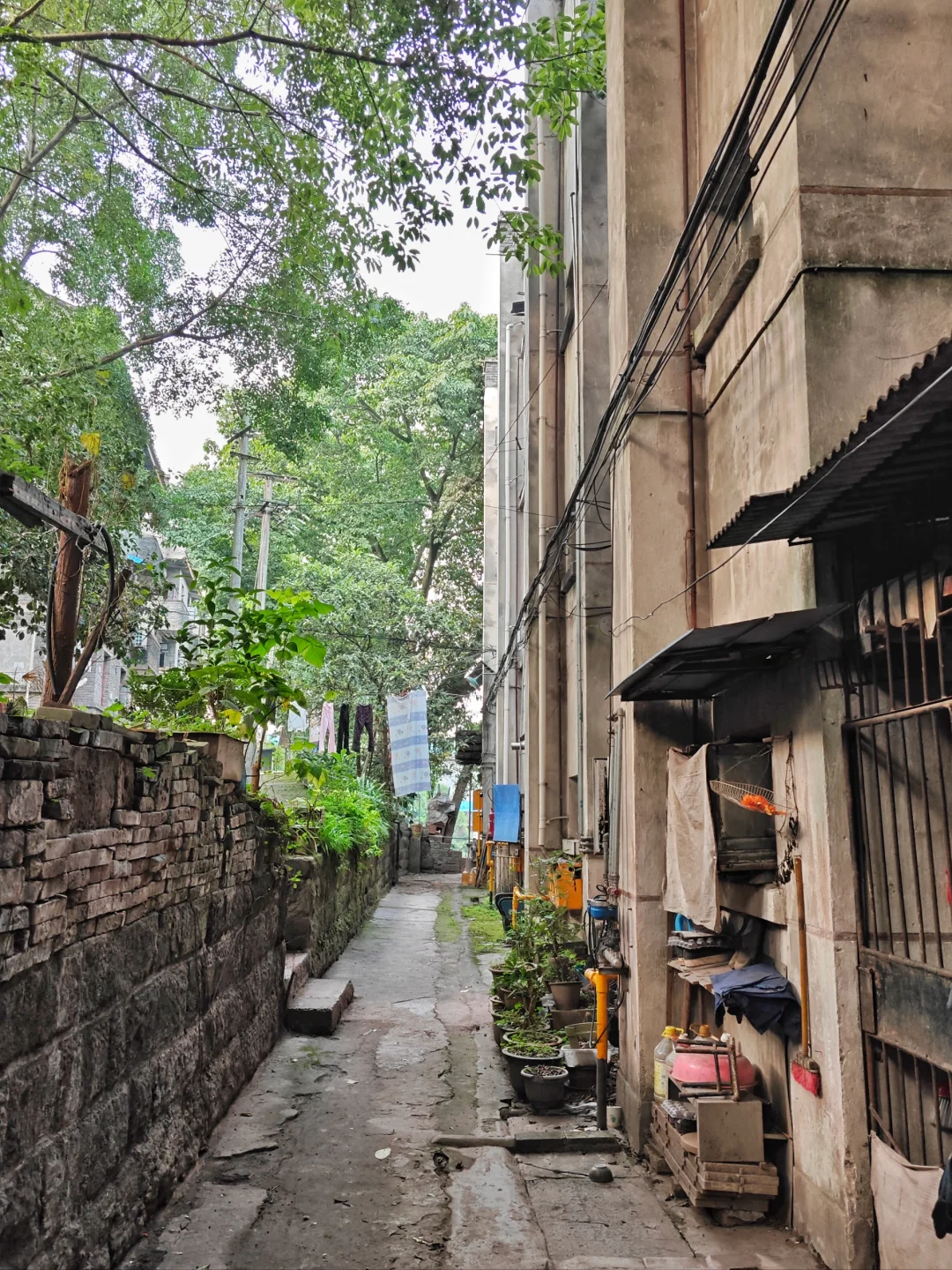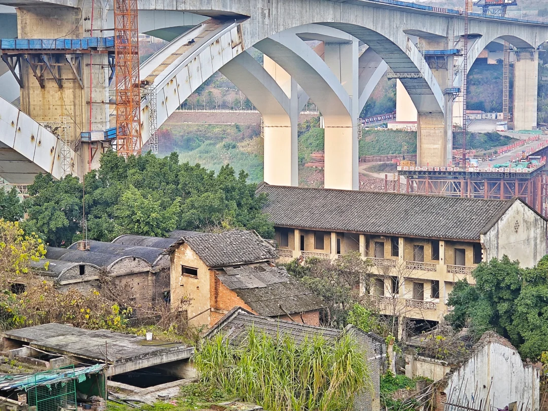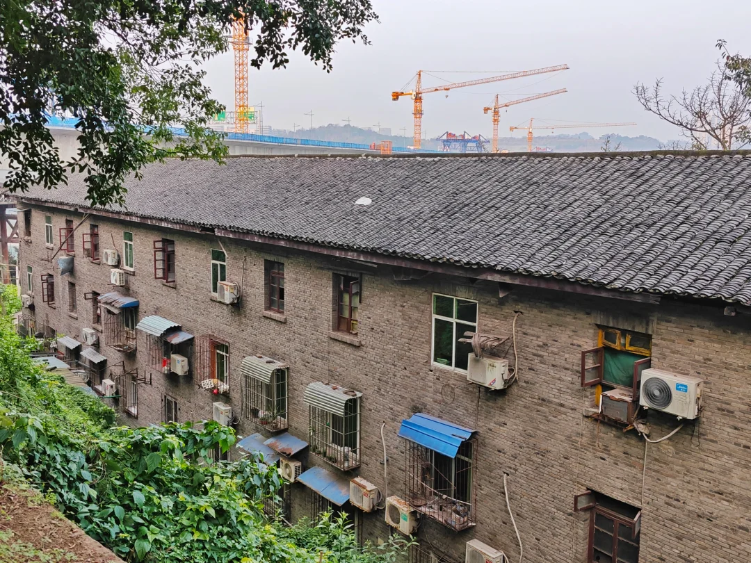 现在,磨床厂老家属区内居民大概还剩一半,这片区域也几乎是半自由状态,大家都可以随意种菜,自己开垦,反正也没人管,所以蔬菜自由倒是实现了。家属区树木高大茂密,冬日的阳光从树荫缝隙洒进家属区,照进一点温暖。家属区最高处有个小山坡,上面有个高大的水塔,周围都是菜地,站在山上遥望江对岸的礼嘉,以及不远处的北碚同兴,还有山下江边磨床厂老厂区,也别有一番风景。当年,这下面还有轮渡可以坐到对岸礼嘉,所以这里居民当年买菜赶场其实还好,要不去礼嘉场,要不去同兴镇。