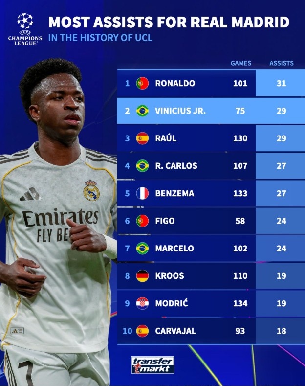 直播吧1月21日讯本轮欧冠,皇马6-1大胜摩纳哥,维尼修斯送出2次助攻,根据德转统计,维尼修斯欧冠助攻数升至皇马队史第二。