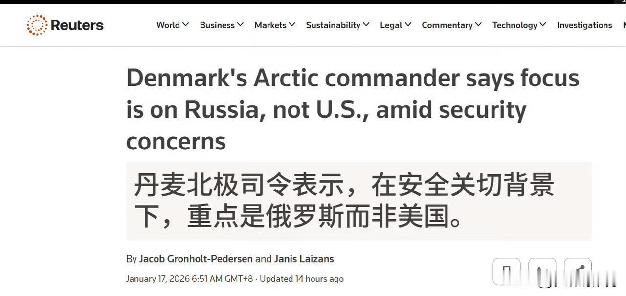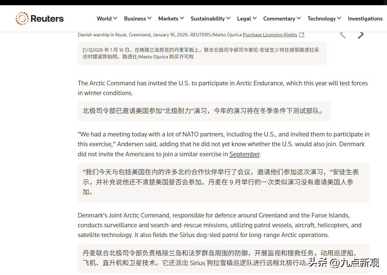 丹麦计划邀请美国参加在格陵兰岛举行的联合军演,目标是防范俄罗斯。丹麦北极司令表示,格陵兰岛当前的安全威胁主要来自俄罗斯而非美国,面对美国的咄咄逼人,北极司令安德森认为,“一个北约国家绝不可能攻击另一个北约国家”美国攻击丹麦是“假设性的”。