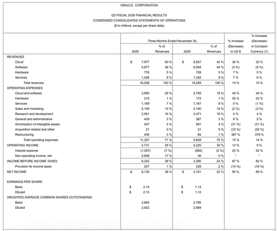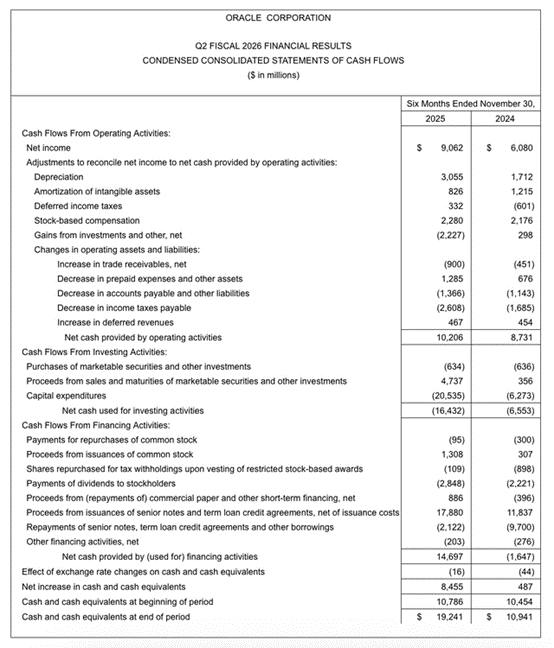在过去两个季度,甲骨文的经营性现金流同比增长17%,达到102亿美元。诚然,过去六个月205亿美元的资本支出,已经远超经营性现金流的规模(且按照全年500亿美元的资本支出预期,这一投入节奏还将加快)。