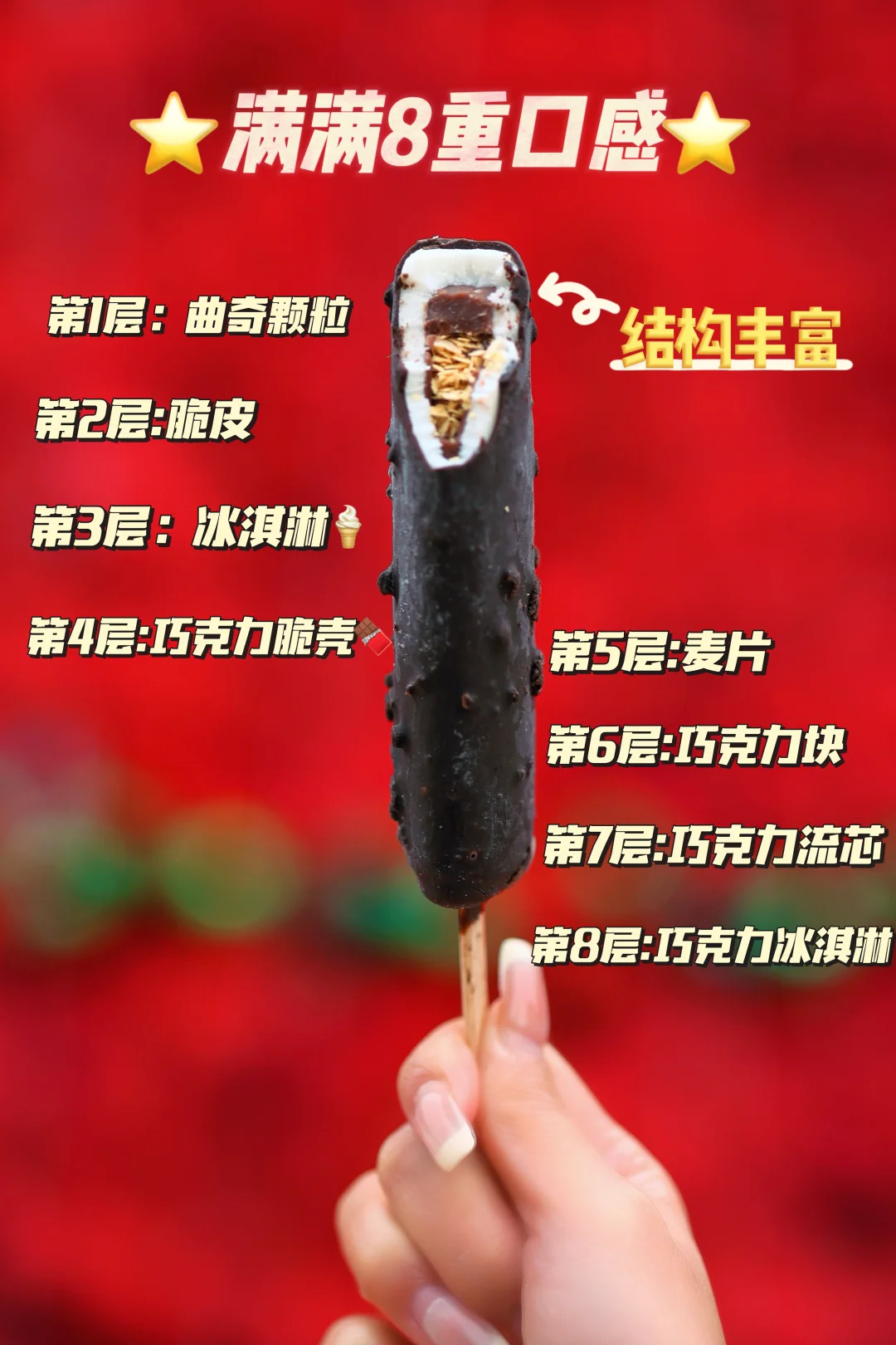 8重口感层层叠加,结构非常丰富,从曲奇颗粒和浓醇巧克力脆皮🍫,到满满爆料的麦片和整颗巧克力块,再到巧克力流芯~每一口都有新的变化与惊喜🫶🏻巧克力脑袋真的狠狠爱了!!!刚刚吃完一根,完全没想到真的有好运降临!朋友接到了心仪公司的面试邀约!我也收到了涨工资📈的消息,简直是事业大满贯,希望大家吃完大满贯后新的一年也能学业大满贯,福气大满贯,事业大满贯噢~🎉🎉