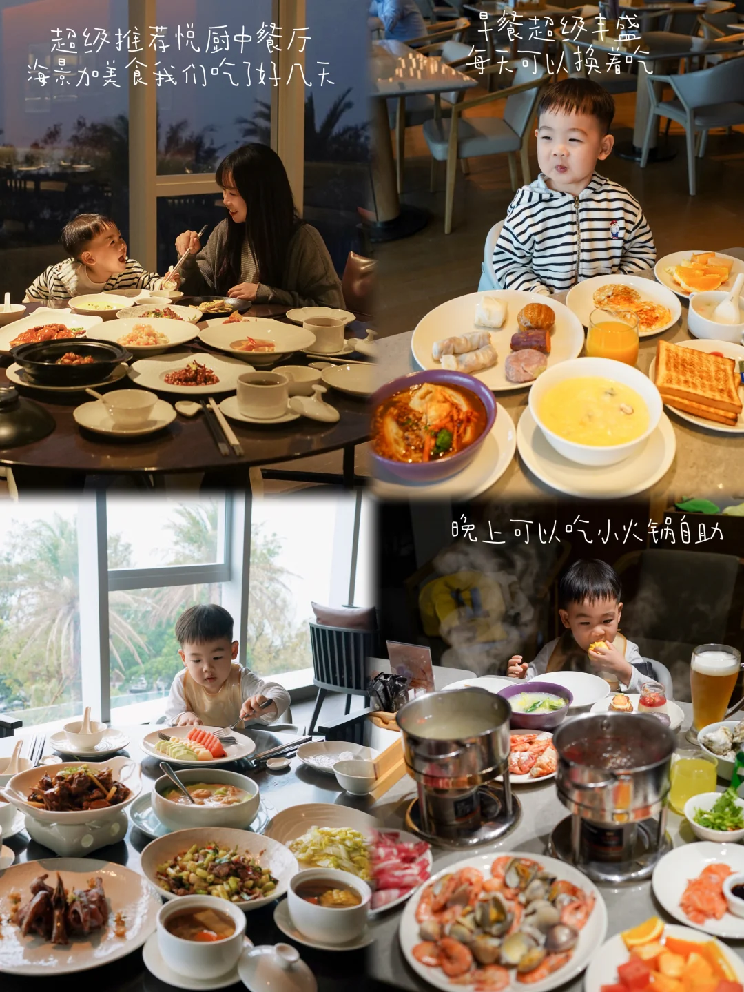 酒店自助早餐很丰盛,我每天一碗螺蛳粉➕海鲜粥,睿宝每天换着花样吃不重样,晚上还可以在这里吃海鲜自助🍴酒店2楼中餐厅悦厨真的要大大夸个👍不仅可以看到海天一色和往来的轮船🛳️吃到正宗的粤菜,桂菜,川菜融合菜🥢总厨曹师傅也很喜欢出来和客人交流菜品,小到开胃泡菜大到茉莉花香玻璃鸽🐦原料都是师傅们自己烹饪,带着老人小孩来吃真的很放心!还有大堂下午茶🍹颜值绝美,搭配窗外的落日海景,这个打卡点,北海找不出第二家了!