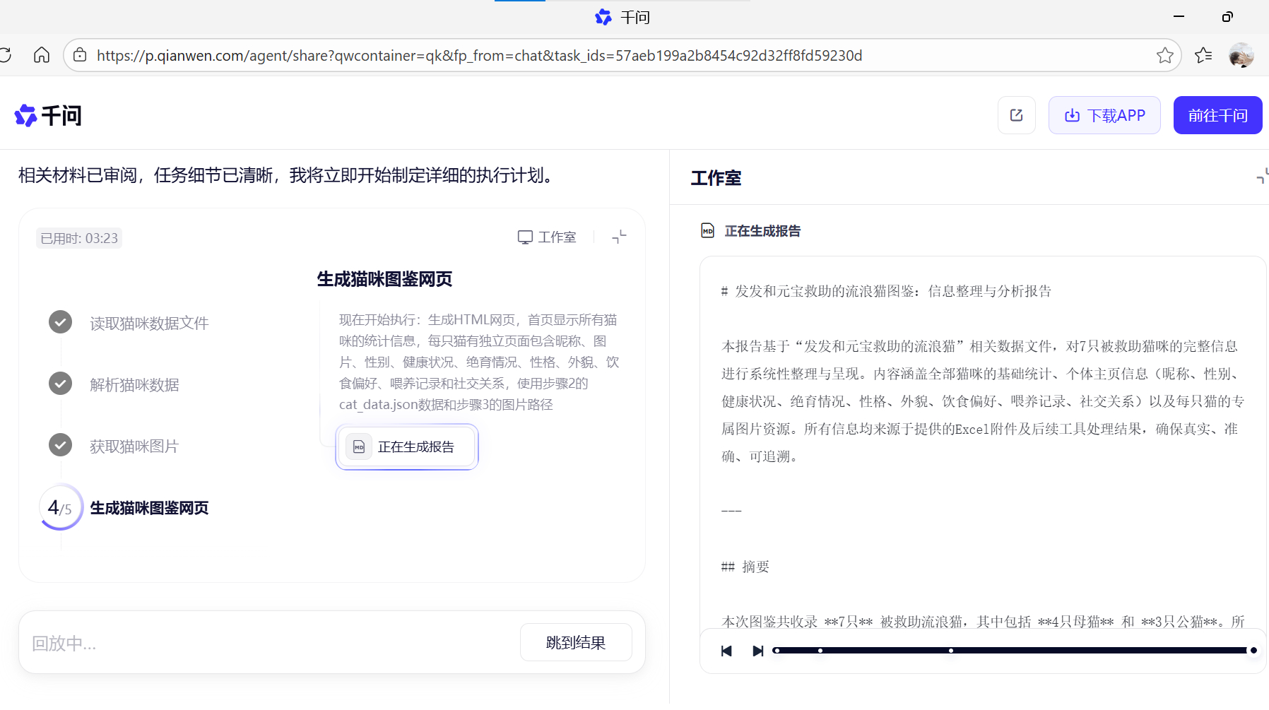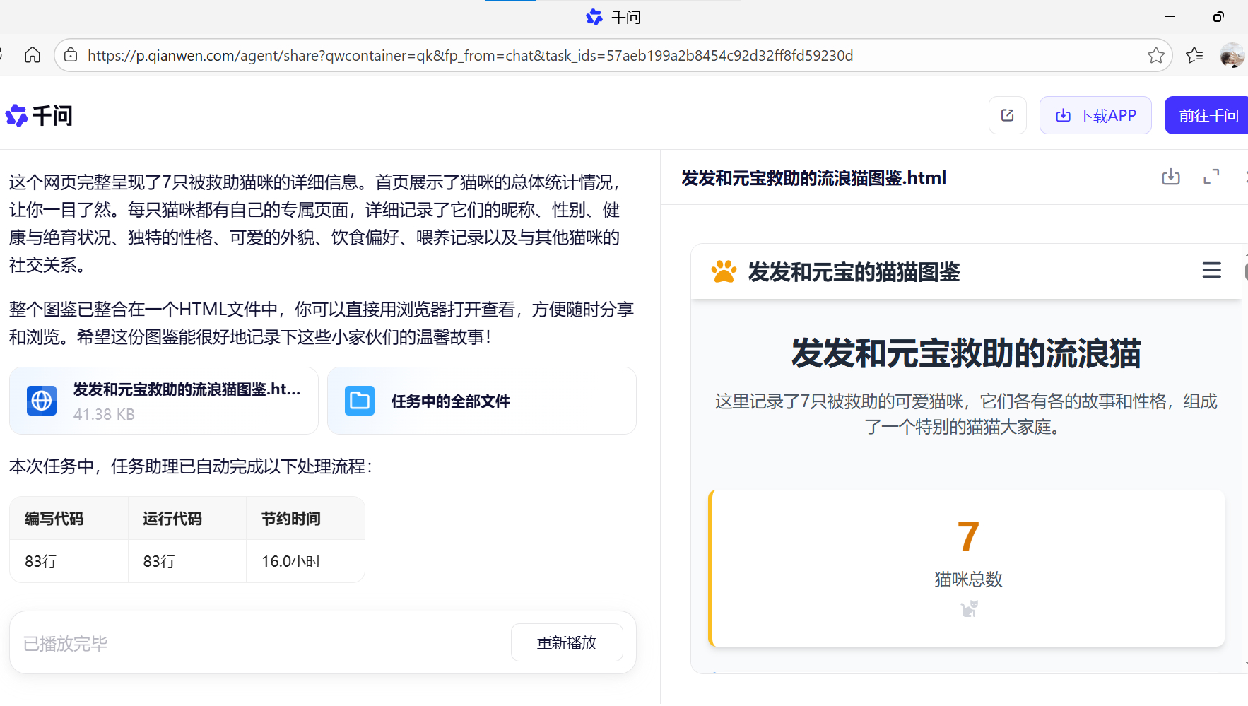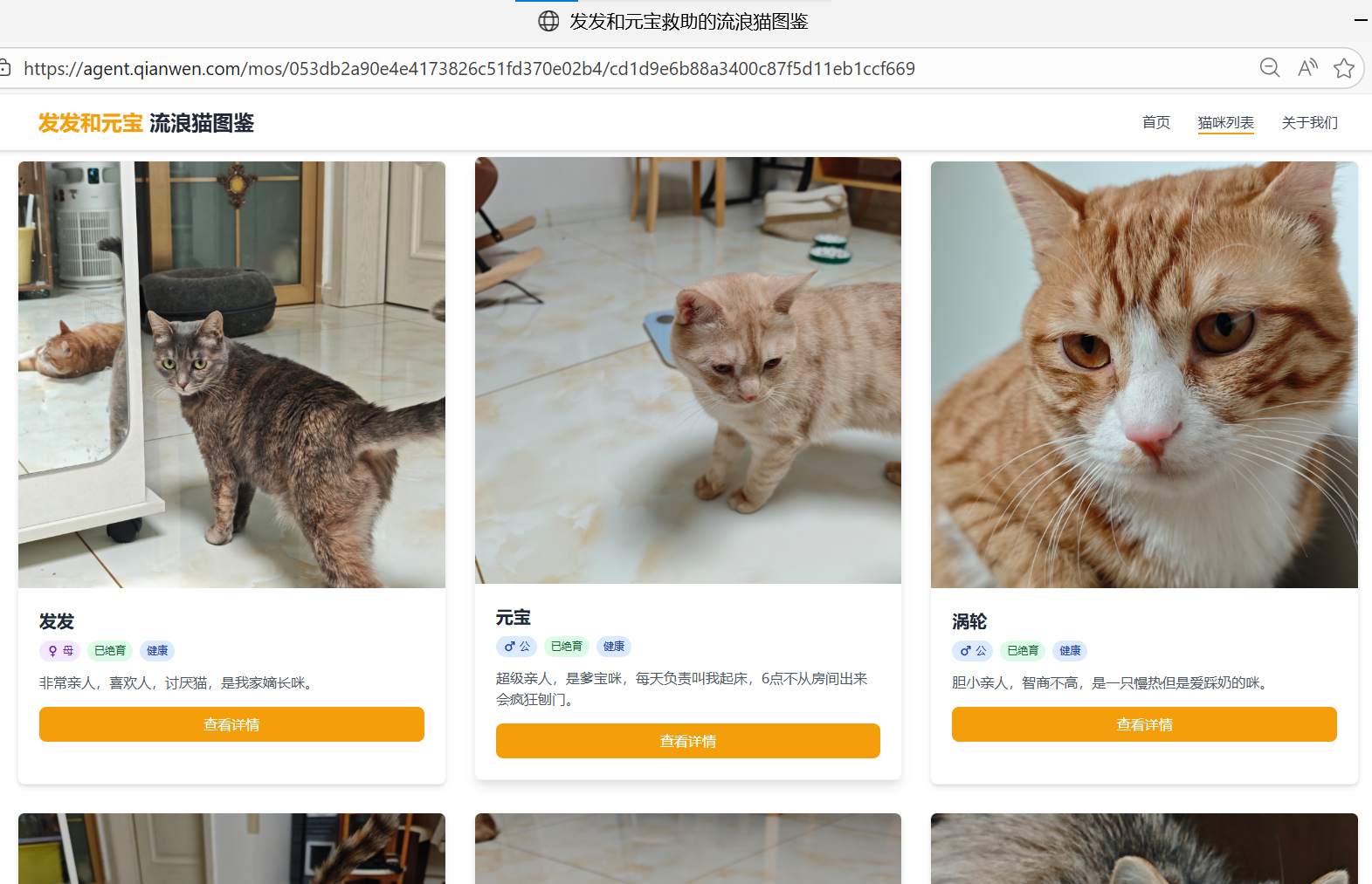 “云养猫”成真了!真的有被暖到——南航的同学们依然在“为爱发电”,但这次有了不一样的助力!用千问任务助理一句话就能免费生成猫咪“电子图鉴”,每只猫咪的基础信息一目了然,还能实时更新投喂记录。无需技术背景,不花一分钱,普通人也能做出这样专业的网页,让救助流浪猫杂乱的手工记录变成清晰可追溯的行动链路。AI的价值不在于炫技,而是让每一份微小的善意都被看见、被串联、被高效落地,或许正是动物保护的新范式。千问给流浪猫办了电子身份证千问上线能干活的任务助理自由的小猫不叫流浪猫