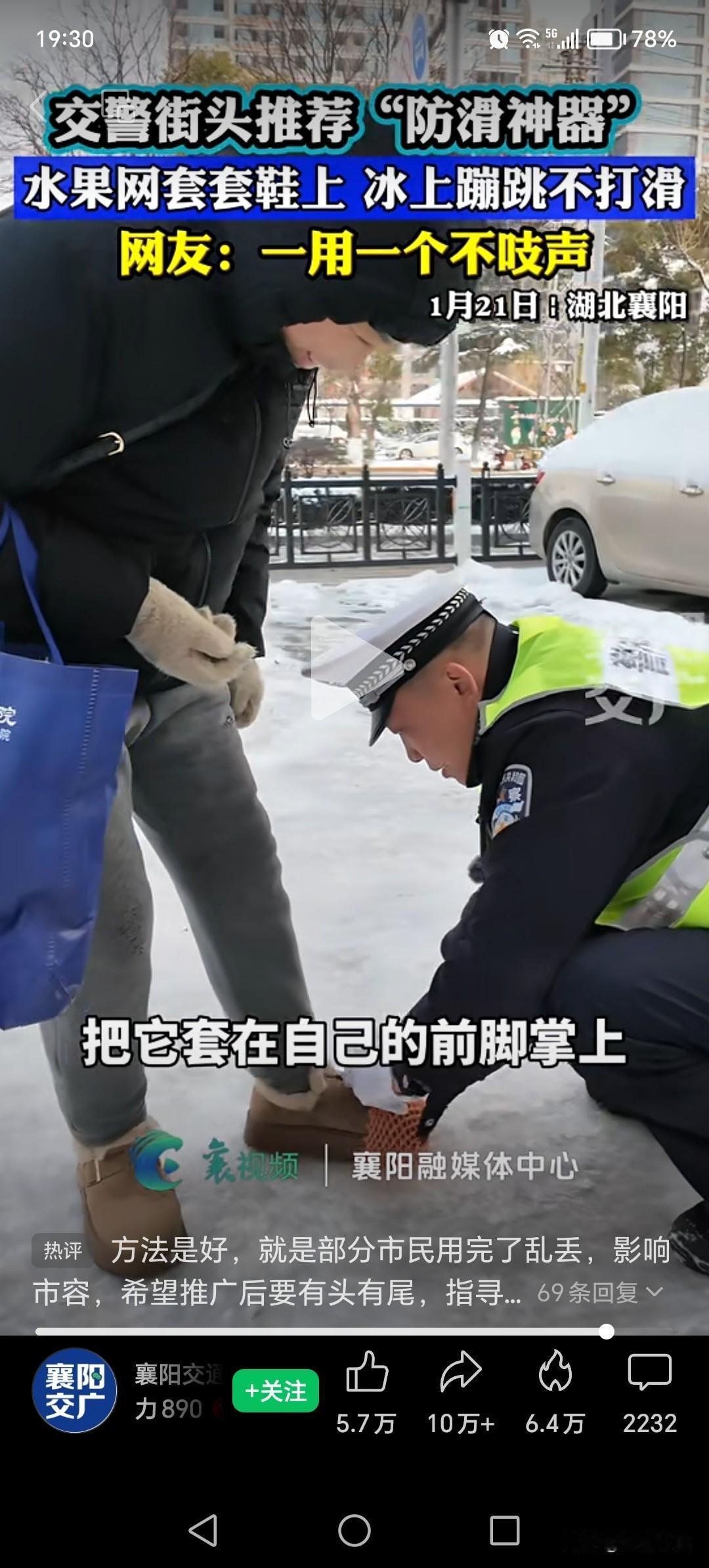 雪天路滑难走,襄阳交警推荐的这款防滑神器,不用花钱买还特别实用,真好。 我不是那种身段灵巧的人,到了冬天很害怕走结了冰的雪地,两脚在鞋里用力抠着鞋底,生怕一不留神就跌个四仰八叉。 偶然看到襄阳交警推荐的防滑办法,真心觉得好用。水果网套大家都知道吧?买回水果再别把它扔了,下雪天出门套在鞋上,摩擦力大增,再不用担心走不稳就滑倒了。