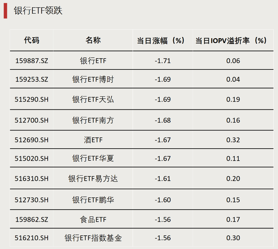 大消费板块集体走弱,白酒方向领跌,银行板块震荡下跌。ETF方面,多只银行ETF跌幅居前。