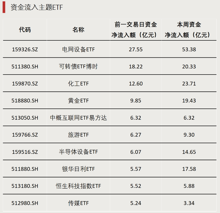 前一交易日(1月20日),电网设备、化工、黄金等主题ETF吸金,多只宽基ETF则遭遇资金净流出,沪深300ETF华泰柏瑞(510300)净流出额超过100亿元,全市场ETF合计近500亿元资金净流出。本周前两个交易日,全市场ETF合计资金净流出额达903亿元。