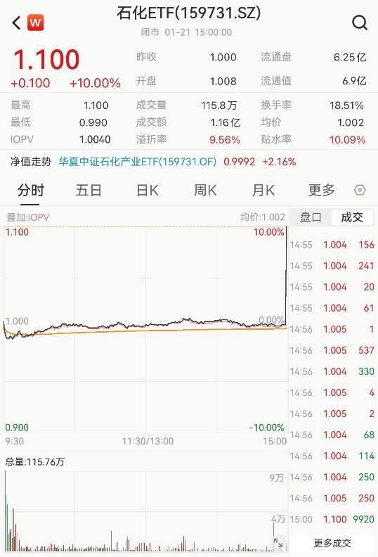 1月21日,有色、半导体板块表现强势,黄金股主题ETF、芯片相关ETF涨幅居前。石化ETF(159731)尾盘突然拉升,瞬间涨停,疑似出现了乌龙指。