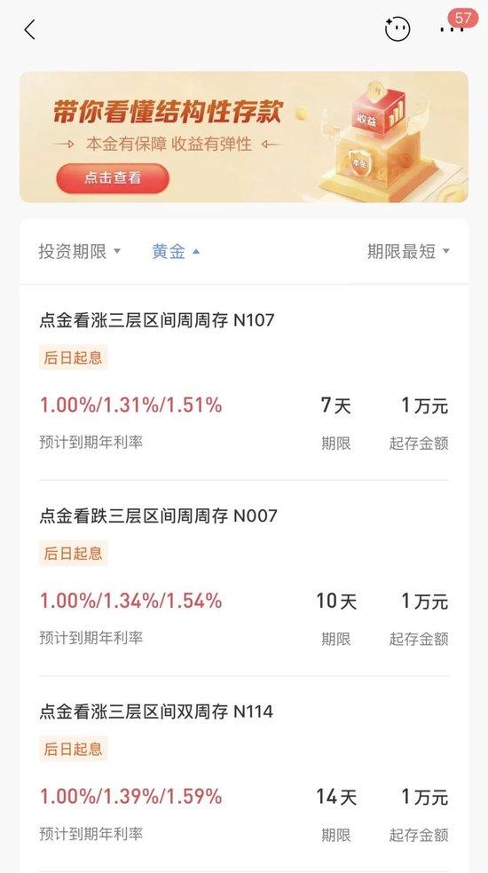 1月12日,招商银行也发行了多款“点金”系列挂钩黄金的结构性存款。招商银行App中显示,目前该行在售的以“黄金”为标的的结构性存款产品共有16款,存款期限从7天至367天不等,起存金额最低为1万元,最高为30万元,预计到期年利率1%-1.78%。