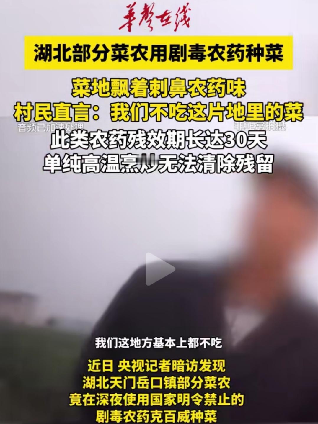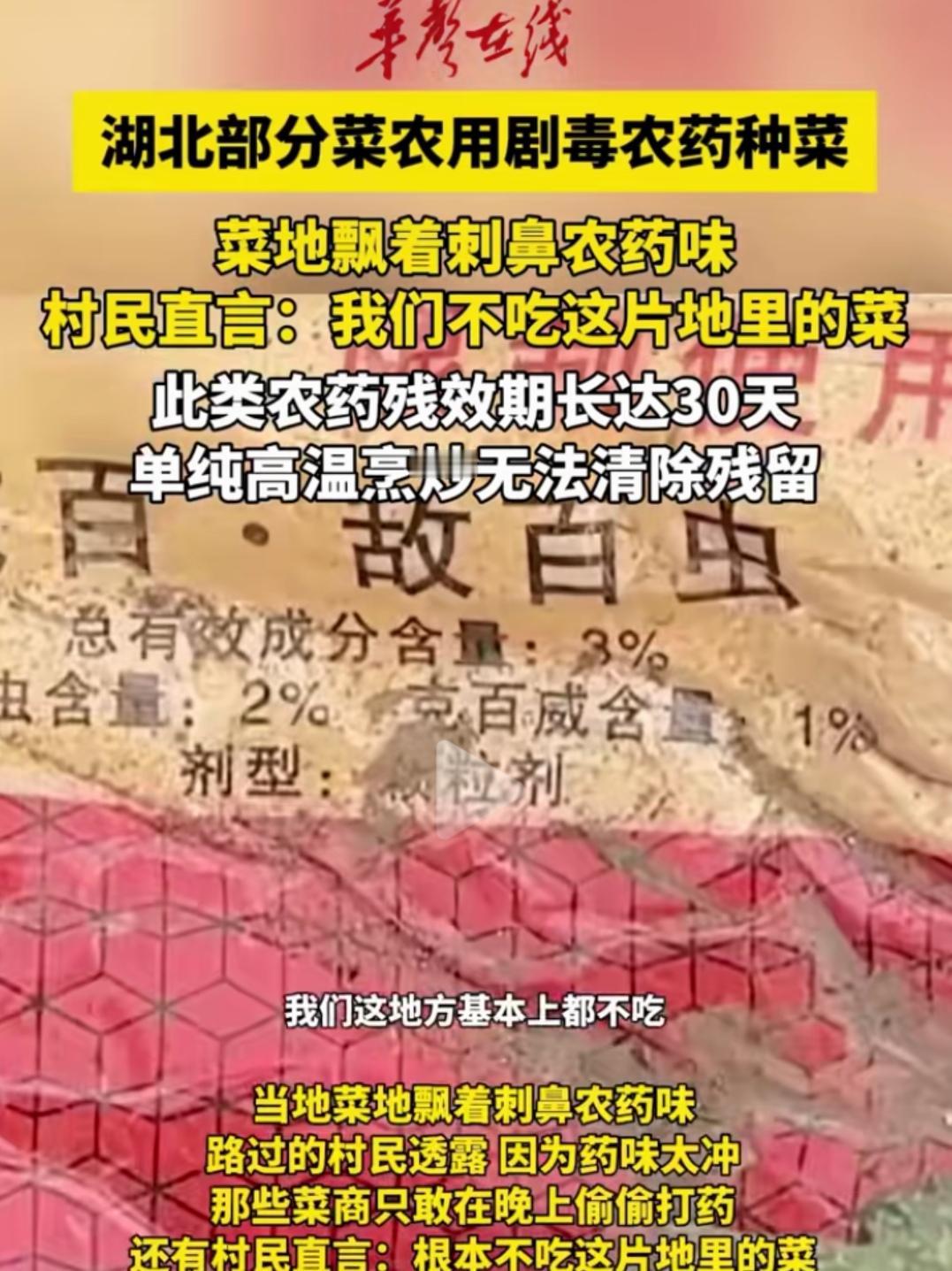 湖北天门菜农用禁用剧毒农药喷菜上,这不是杀虫,这是投毒! 先看看关键词:明令禁止疏菜水果使用,剧毒,农药残留有效期30天,单纯高温烹炒无法消除,名称克百威,晚上偷偷打药,菜地刺鼻。 从这些报道的关键词判断,使用者既知道是什么农药,也知道后果是什么,但他们就是敢用,这不仅仅是利益问题,不是杀虫,这更是投毒! 湖北天门岳口镇莱农纯粹是利益薰心,良尽天良,致人的生命健康于不顾,自己不吃,证明他们知道后果! 为了利益,什么都敢干,多亏报道被查,这么大一片菜地,不知道己害了多少人,还要害多少人!农药超标蔬菜 农药蔬菜