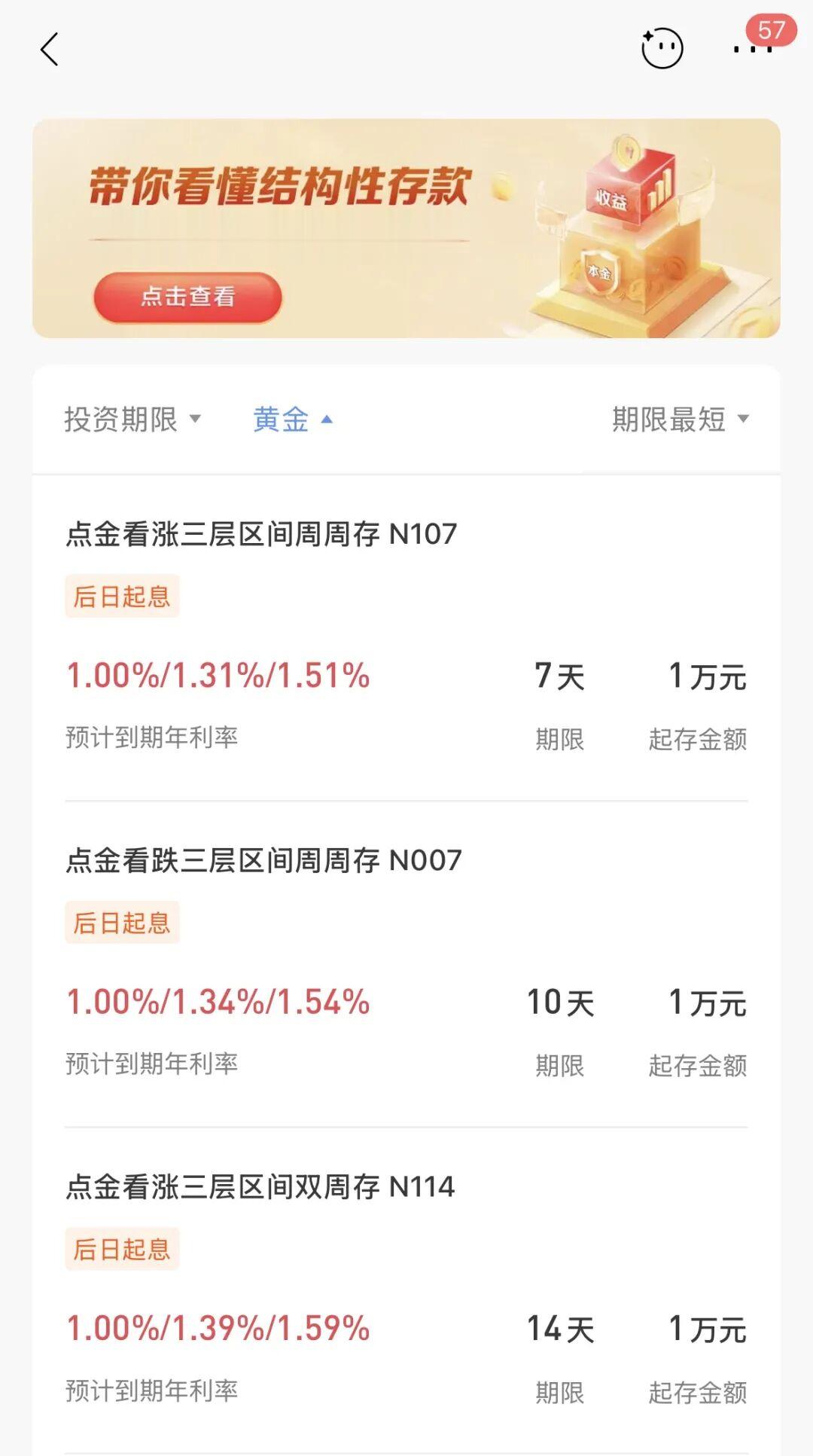 1月12日,招商银行也发行了多款“点金”系列挂钩黄金的结构性存款。招商银行App中显示,目前该行在售的以“黄金”为标的的结构性存款产品共有16款,存款期限从7天至367天不等,起存金额最低为1万元,最高为30万元,预计到期年利率1%-1.78%。