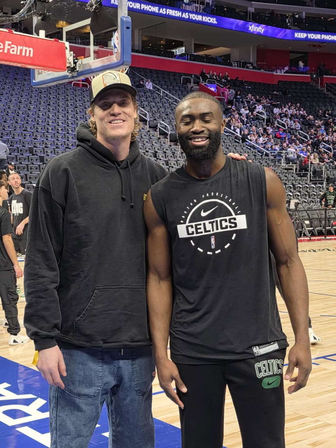 “凯尔特人对阵活塞,你知道这比赛我必须来!时光飞逝!继续开拓你们的冠军之路吧,很高兴能看到大家☘!”约纳斯-杰雷布科附文道。