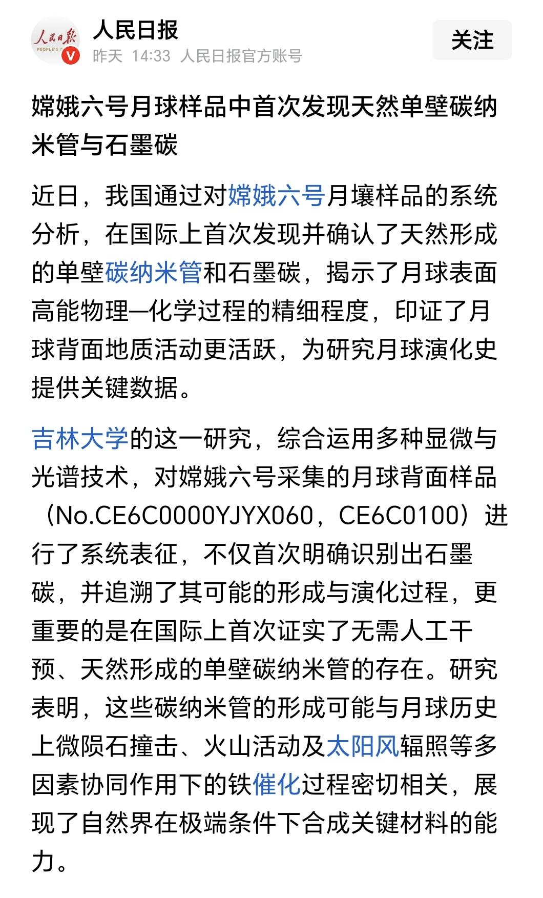 嫦娥六号月壤研究新发现:月球样品中首次发现天然单壁碳纳米管与石墨碳,月背地质活动更活跃。 话说,美弟不是搞了几百斤月壤回来么,研究成果咋就压根不一样?懂的不说,偏的不信,就等一个时间点吧。