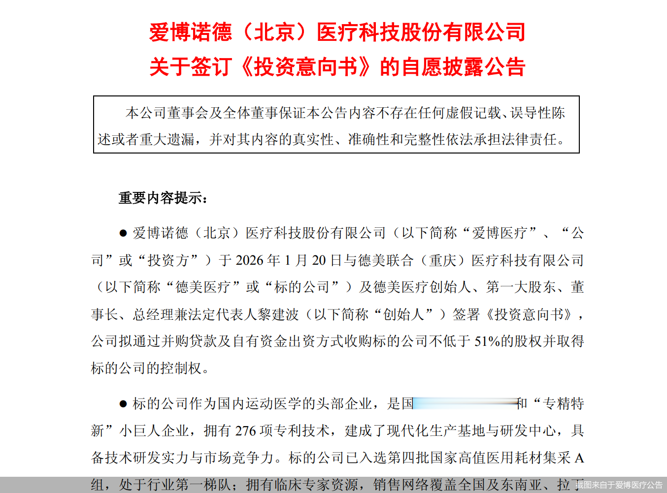 1月21日,爱博医疗发布公告称,公司于1月20日与德美医疗及其创始人、第一大股东、董事长、总经理兼法定代表人黎建波签署《投资意向书》,公司拟通过并购贷款及自有资金出资方式收购德美医疗不低于51%的股权并取得标的公司的控制权。公司预估本次拟收购的标的公司整体估值不超过10亿元。
