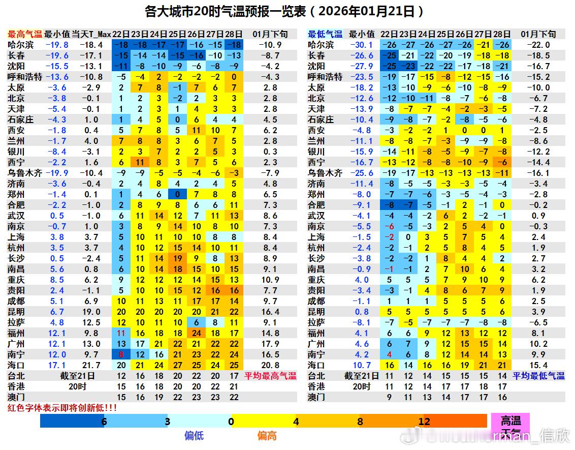 【气温触底反弹 南方大回暖】明晨南方部分地区的气温还会小幅下探,预计最低:南宁4℃、南昌零下1℃、上海零下2℃、南京零下6℃,可能创立冬后气温新低。不过从22日白天开始,我国大部地区气温回升,南方比北方升温更明显,最高气温比最低气温升幅更明显。除了东北一带,我国大部地区的气温将逐渐转为偏高。省会城市中,气温升幅最大的可能是长沙。今天最高零下2.4℃、25日回到19℃,累计升温可达21℃。贵阳今天最高零下1.1℃,25日将回到15℃;南昌今天最高0.8℃、25日最高18℃,升幅也会超15℃。最近5天连续在0℃以下的北京、天津,明天下午气温有望回到0℃以上。