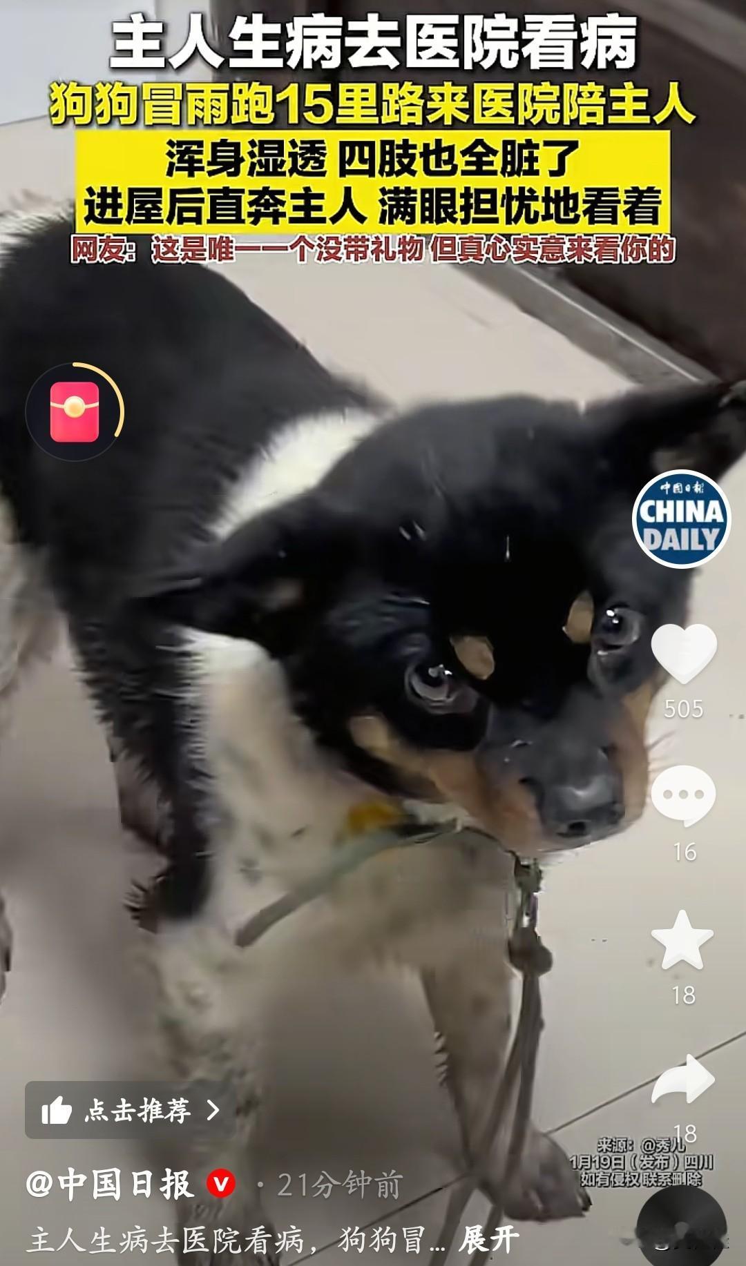 2026年第一感人“狗狗”出现了!这只满身是泥的狗狗,刚登上了“中国日报”,看哭了好多人! 主人去医院看病,它在家坐不住,冒着冷雨一口气跑了15里路追到医院。等找到主人时,它浑身湿透,四条腿全是泥,活像个小泥猴。一进病房,它啥也不管,直奔主人身边,就那么满眼担忧地盯着,好像在说“你没事吧?” 的确是“这是唯一一个没带礼物,但真心实意来看你的。” 在这个冬天,这份跨越物种的陪伴,比任何话语都暖。它不懂什么是生病,只知道要守在你身边;它不会说安慰的话,却用15里的奔跑,把“爱”写得明明白白。原来最好的陪伴,从来都不需要语言。
