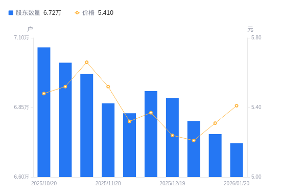日期A股户数(户)流通A股户均持股数(股)户均持股市值(万元)2026-01-206721113425.707.262026-01-096754413359.517.092025-12-316801713266.606.912025-12-196884613106.856.872025-12-106908913060.757.012025-11-286829113213.377.032025-11-206864813144.667.262025-11-106969812946.637.332025-10-317010912870.747.102025-10-207066112770.197.00