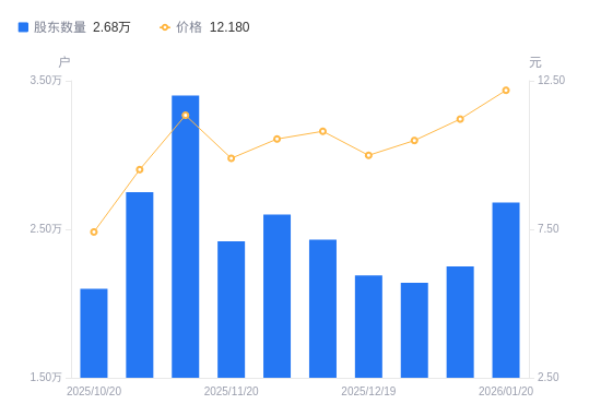 日期A股户数(户)流通A股户均持股数(股)户均持股市值(万元)2026-01-202680012910.8115.732026-01-092250015378.2117.242025-12-312140016168.6816.962025-12-192190015799.5315.782025-12-102430014239.0915.382025-11-282600013308.0714.032025-11-202420014297.9314.142025-11-103400010176.7611.542025-10-312750012582.1711.972025-10-202100016476.6612.21