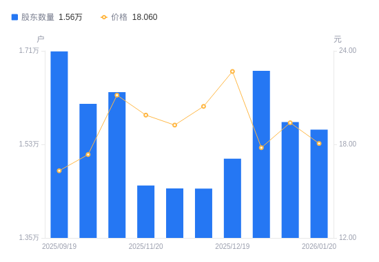 日期A股户数(户)流通A股户均持股数(股)户均持股市值(万元)2026-01-201558310980.6319.832026-01-091573010878.0121.092025-12-311671610236.3718.212025-12-191502411389.1825.832025-12-101445111840.7824.202025-11-281445411838.3222.782025-11-201450911793.4523.452025-10-311630510494.4022.212025-09-301608010641.2418.462025-09-191709110011.7716.33