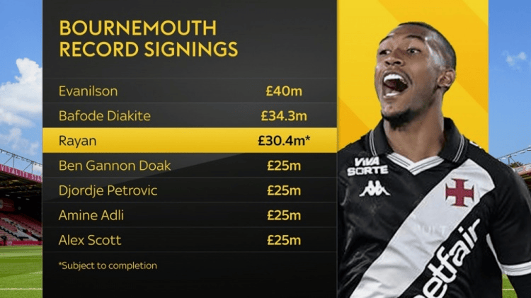 虎扑01月21日讯据此前多家媒体的报道,伯恩茅斯将签下瓦斯科达伽马19岁中锋拉扬,而天空体育表示转会费为3040万镑。该媒体也统计了伯恩茅斯队史引援花费榜。